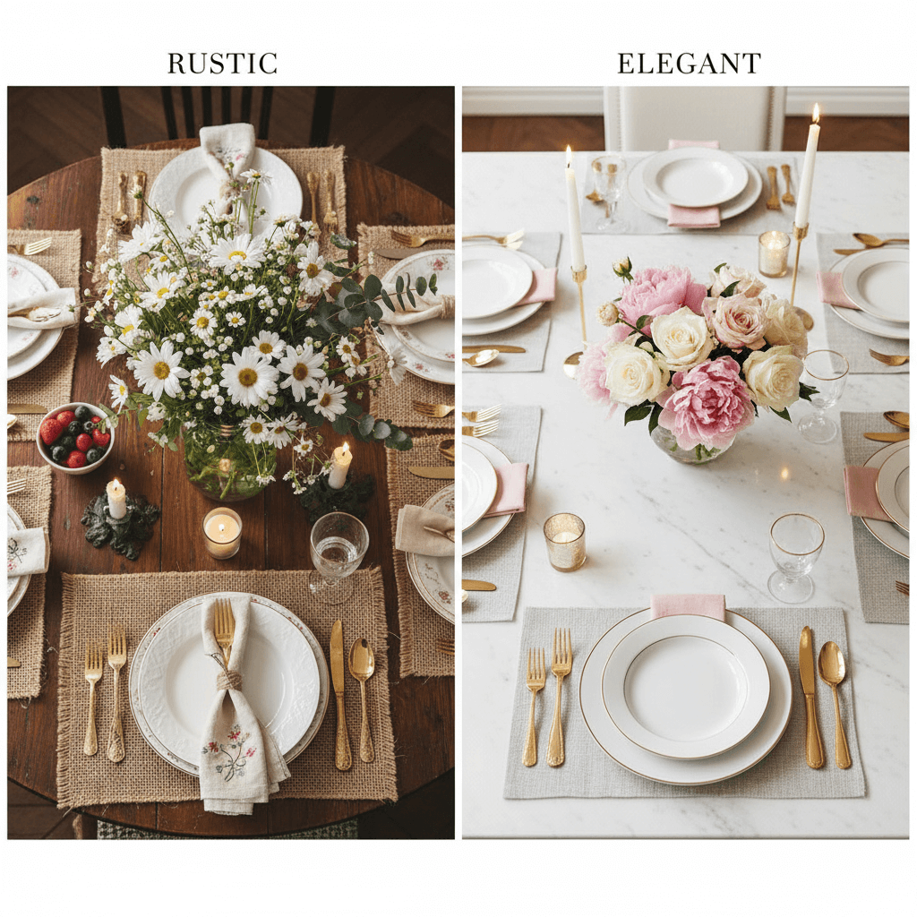 Na imagem acima você vê a comparação perfeita: à esquerda, uma mesa rústica, quente e cheia de texturas; à direita, uma mesa clássica, limpa e sofisticada. Ambos os estilos têm charme — a questão é: qual combina mais com sua casa, sua rotina e o tipo de recepção que você gosta de fazer? Neste guia você vai entender as diferenças práticas, saber quais itens priorizar e encontrar sugestões de produtos (na Shopee) para começar hoje mesmo.